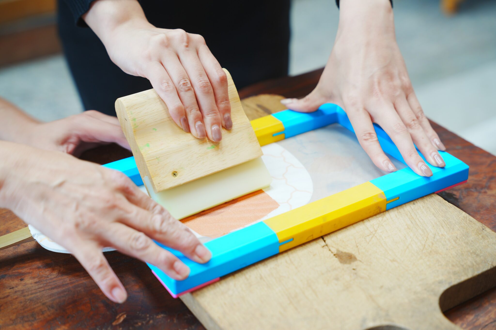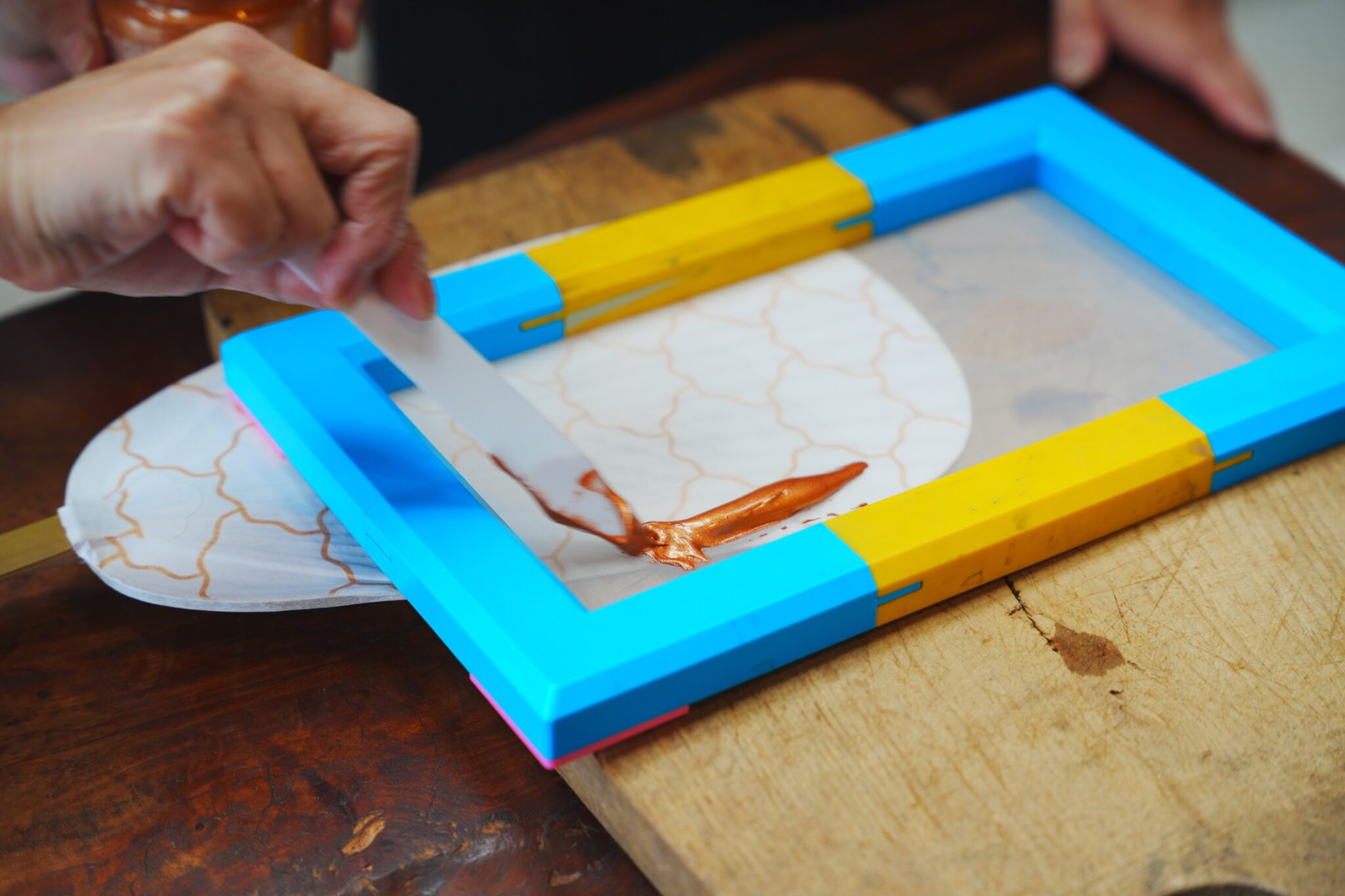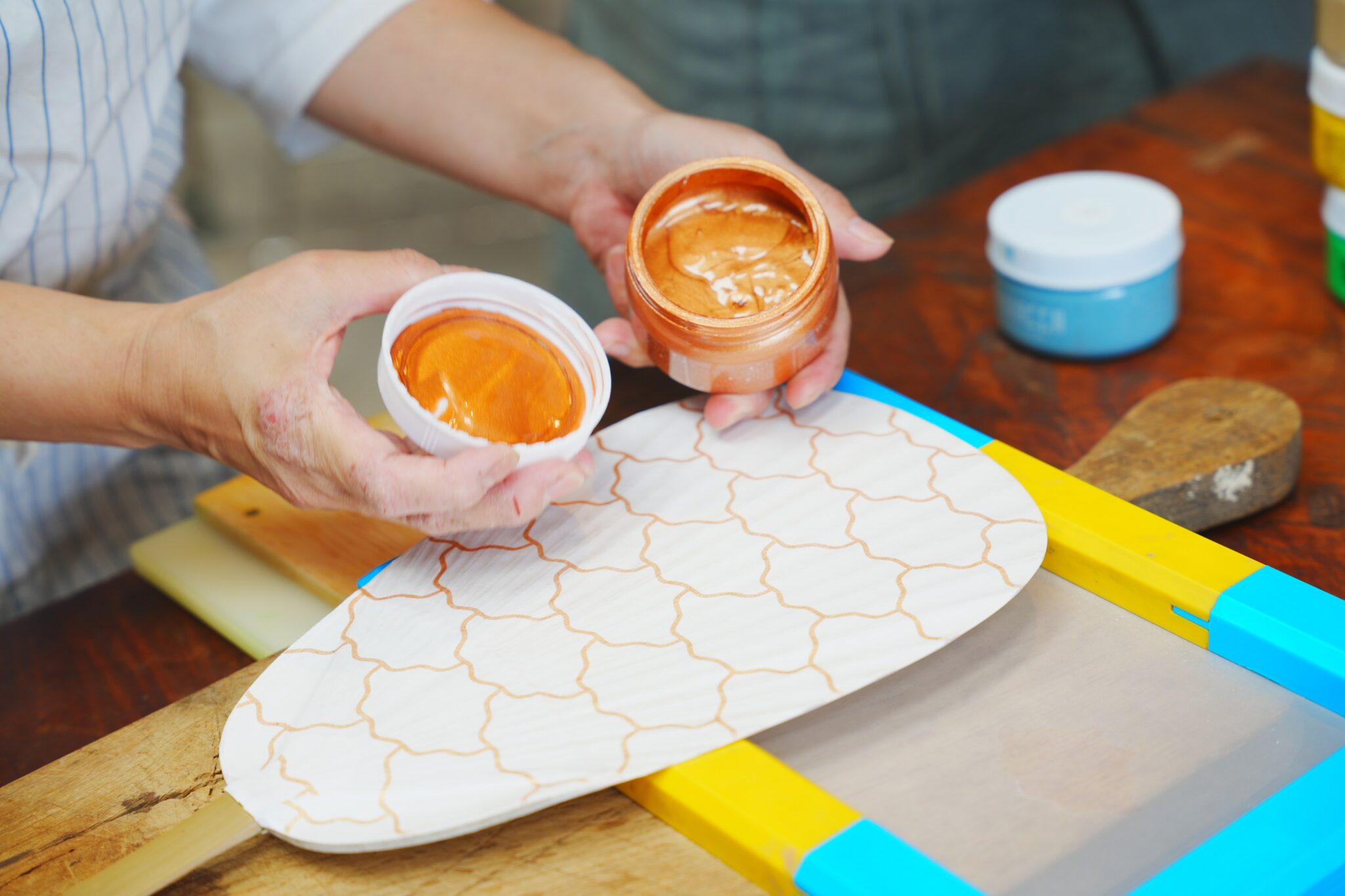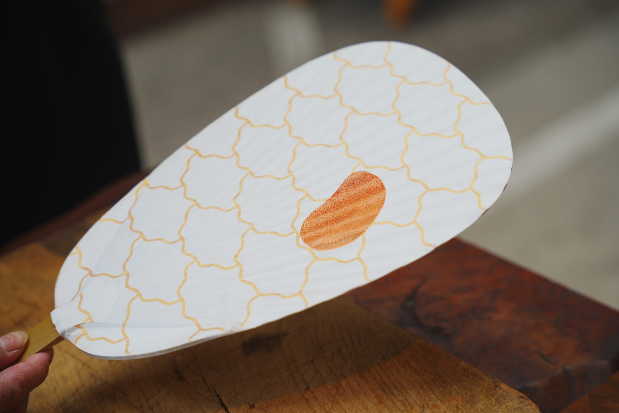 このうちわにシルクスクリーンで絵柄を乗せるのですが、今回はしょうゆ豆の形と波の形の版が用意されていました。